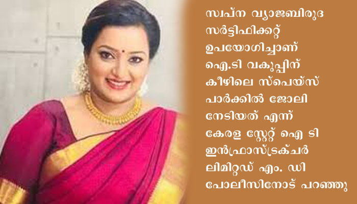 ഐ ടി വകുപ്പിന് കീഴിലെ സ്പെയ്സ് പാർക്കിൽ ജോലി നേടിയത് വ്യാജ ബിരുദ സർട്ടിഫിക്കറ്റ് ഉപയോഗിച്ചാണന്ന് കേരള സ്റ്റേറ്റ് ഐ ടി ഇൻഫ്രാസ്ട്രക്ചർ ലിമിറ്റഡ് എം. ഡി കേരള പോലീസിന് പരാതി നൽകിയിരുന്നു.