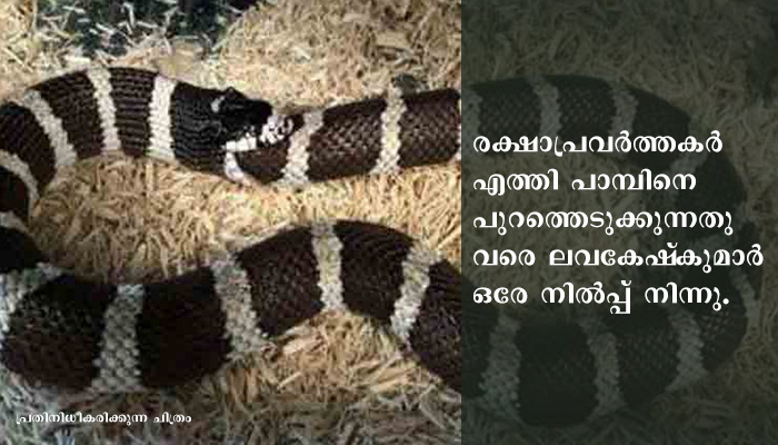 ഇതു മനസിലായ ലവകേഷ്കുമാര് മറ്റ് തൊഴിലാളികളെ വിളിച്ചുണര്ത്തി വിവരം പറഞ്ഞുമനസിലാക്കി. മറ്റ് തൊഴിലാളികള് എഴുന്നേറ്റ് ലവേഷ്കുമാറിനെ എഴുന്നേല്പ്പിച്ചു നിര്ത്തി. രക്ഷാപ്രവര്ത്തകരെത്തി പാമ്പിനെ പുറത്തെടുക്കുന്നതുവരെ ലവകേഷ്കുമാര് ഒരേ നില്പ്പ് നിന്നു. വിവരമറിഞ്ഞ് സംഭവസ്ഥലത്തെത്തിയ പൊലീസ്- സുരക്ഷാ അധികൃതര് പാന്റ് കീറിയാണ് പാമ്പിനെ പുറത്തുചാടിച്ചത്. ഏഴുമണിക്കൂര് സമയം പാന്റില് കിടന്നിട്ടും പാമ്പ് ഒരിക്കല്പോലും ലവകേഷ് കുമാറിനെ ദംശിച്ചില്ല.