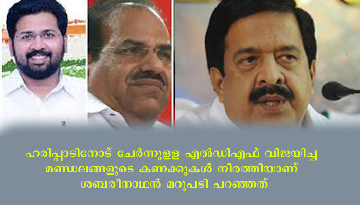 അരുവിക്കര എംഎല്എ കെഎസ് ശബരീനാഥനും സിപിഎംനും കോടിയേരിക്കുമെതിരെ വിമര്ശനവുമായി എത്തി. ചെന്നിത്തലയുടെ മണ്ഡലമായ ഹരിപ്പാട് കഴിഞ്ഞ പാര്ലിമെന്റ് തിരഞ്ഞെ ടുപ്പില് ബിജെപി സ്ഥാനാര്ത്ഥിക്ക് വോട്ടു കൂടിയതിനെ ചൂണ്ടിക്കാണിച്ചാണ് കോടിയേരി വിമര്ശിച്ചത്. ഇതിനെതിരെ ഹരിപ്പാടിനോട് ചേര്ന്നുളള എല്ഡിഎഫ് വിജയിച്ച മണ്ഡലങ്ങളുടെ കണക്കുകള് നിരത്തിയാണ് ശബരീനാഥന് മറുപടി പറഞ്ഞത്.