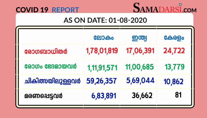 തിരുവനന്തപുരം: കേരളത്തില് ശനിയാഴ്ച (01-08-2020) 1129 പേര്ക്ക് കോവിഡ്-19 സ്ഥിരീകരിച്ചതായി ആരോഗ്യ വകുപ്പ് മന്ത്രി കെ.കെ. ശൈലജ ടീച്ചര് അറിയിച്ചു. തിരുവനന്തപുരം ജില്ലയിലെ 259 പേര്ക്കും, കാസര്ഗോഡ് ജില്ലയിലെ 153 പേര്ക്കും, മലപ്പുറം ജില്ലയിലെ 141 പേര്ക്കും, കോഴിക്കോട് ജില്ലയിലെ 95 പേര്ക്കും, പത്തനംതിട്ട ജില്ലയിലെ 85 പേര്ക്കും, തൃശൂര് ജില്ലയിലെ 76 പേര്ക്കും, ആലപ്പുഴ ജില്ലയിലെ 67 പേര്ക്കും, എറണാകുളം ജില്ലയിലെ 59 പേര്ക്കും, കോട്ടയം, പാലക്കാട് ജില്ലകളിലെ 47 പേര്ക്ക് വീതവും, വയനാട് ജില്ലയിലെ 46 പേര്ക്കും, കൊല്ലം ജില്ലയിലെ 35 പേര്ക്കും, ഇടുക്കി ജില്ലയിലെ 14 പേര്ക്കും, കണ്ണൂര് ജില്ലയിലെ 5 പേര്ക്കുമാണ് ശനിയാഴ്ച രോഗം സ്ഥിരീകരിച്ചത്. തിരുവനന്തപുരം, തൃശൂര് ജില്ലകളില് മരണമടഞ്ഞ 2 വ്യക്തികളുടെ പരിശോധനാഫലവും ഇതില് ഉള്പെടുന്നു. മലപ്പുറം കൊണ്ടോട്ടി സ്വദേശി കോയാമു (82), എറണാകുളം ആലുവ സ്വദേശി അഷ്റഫ് (52), എറണാകുളം സ്വദേശി എയ്ഞ്ചല് (81), കാസര്ഗോഡ് തൃക്കരിപ്പൂര് സ്വദേശി അബ്ദുള് റഹ്മാന് (72), തിരുവനന്തപുരം നെടുമങ്ങാട് സ്വദേശി ബാബു (62), കോഴിക്കോട് ബീച്ച് സ്വദേശി നൗഷാദ് (49), കൊല്ലം ജില്ലയിലെ അസുമാ ബീവി (73), തൃശൂര് ഇരിങ്ങാലക്കുട സ്വദേശി ചന്ദ്രന് (59) എന്നിവരുടെ മരണം കോവിഡാണെന്ന് സ്ഥിരീകരിച്ചു. ഇതോടെ ആകെ മരണം 81 ആയി.