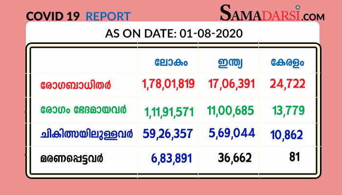 തിരുവനന്തപുരം: കേരളത്തില് ശനിയാഴ്ച (01-08-2020) 1129 പേര്ക്ക് കോവിഡ്-19 സ്ഥിരീകരിച്ചതായി ആരോഗ്യ വകുപ്പ് മന്ത്രി കെ.കെ. ശൈലജ ടീച്ചര് അറിയിച്ചു. തിരുവനന്തപുരം ജില്ലയിലെ 259 പേര്ക്കും, കാസര്ഗോഡ് ജില്ലയിലെ 153 പേര്ക്കും, മലപ്പുറം ജില്ലയിലെ 141 പേര്ക്കും, കോഴിക്കോട് ജില്ലയിലെ 95 പേര്ക്കും, പത്തനംതിട്ട ജില്ലയിലെ 85 പേര്ക്കും, തൃശൂര് ജില്ലയിലെ 76 പേര്ക്കും, ആലപ്പുഴ ജില്ലയിലെ 67 പേര്ക്കും, എറണാകുളം ജില്ലയിലെ 59 പേര്ക്കും, കോട്ടയം, പാലക്കാട് ജില്ലകളിലെ 47 പേര്ക്ക് വീതവും, വയനാട് ജില്ലയിലെ 46 പേര്ക്കും, കൊല്ലം ജില്ലയിലെ 35 പേര്ക്കും, ഇടുക്കി ജില്ലയിലെ 14 പേര്ക്കും, കണ്ണൂര് ജില്ലയിലെ 5 പേര്ക്കുമാണ് ശനിയാഴ്ച രോഗം സ്ഥിരീകരിച്ചത്. തിരുവനന്തപുരം, തൃശൂര് ജില്ലകളില് മരണമടഞ്ഞ 2 വ്യക്തികളുടെ പരിശോധനാഫലവും ഇതില് ഉള്പെടുന്നു. മലപ്പുറം കൊണ്ടോട്ടി സ്വദേശി കോയാമു (82), എറണാകുളം ആലുവ സ്വദേശി അഷ്റഫ് (52), എറണാകുളം സ്വദേശി എയ്ഞ്ചല് (81), കാസര്ഗോഡ് തൃക്കരിപ്പൂര് സ്വദേശി അബ്ദുള് റഹ്മാന് (72), തിരുവനന്തപുരം നെടുമങ്ങാട് സ്വദേശി ബാബു (62), കോഴിക്കോട് ബീച്ച് സ്വദേശി നൗഷാദ് (49), കൊല്ലം ജില്ലയിലെ അസുമാ ബീവി (73), തൃശൂര് ഇരിങ്ങാലക്കുട സ്വദേശി ചന്ദ്രന് (59) എന്നിവരുടെ മരണം കോവിഡാണെന്ന് സ്ഥിരീകരിച്ചു. ഇതോടെ ആകെ മരണം 81 ആയി.