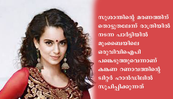 സുശാന്തിന്റെ മരണത്തിന് തൊട്ടുതലേന്ന് രാത്രിയില് നടന്ന പാര്ട്ടിയില് മുംബൈയിലെ ഒരുവിവിഐപി പങ്കെടുത്തുവെന്നാണ് കങ്കണ റണാവത്തിന്റെ ട്വിറ്റര് ഹാന്ഡിലില് സൂചിപ്പിക്കുന്നത്. തനിക്ക് പ്രമുഖരുടെ പേര് വിളിച്ചുപറയാന് ഭയമില്ലെന്നും, തന്നെ വീട്ടില് തൂങ്ങി മരിച്ച നിലയില് കണ്ടെത്തിയാല് അത് ആത്മഹത്യയല്ലെന്ന് എല്ലാവരും മനസ്സിലാക്കിക്കൊള്ളണമെന്നും പറയുന്നു കങ്കണ. നിര്മ്മാതാവും സംവിധായകനുമായ കരണ് ജോഹറുടെ സുഹൃത്ത്, ലോകത്തെ ഏറ്റവും നല്ല മുഖ്യമന്ത്രിയുടെ മകന്, എല്ലാവരും സ്നേഹത്തോടെ ബേബി പെന്ക്വിന് എന്ന് വിളിക്കുന്ന വ്യക്തി’, എന്നാണ് കങ്കണ നല്കുന്ന സൂചനകള്. ആദിത്യ താക്കറെയാണ് സുശാന്തിന്റെ വീട്ടില് അന്ന് നടന്ന പാര്ട്ടിയില് പങ്കെടുത്ത പ്രമുഖന് എന്നാണ് നടിയുടെ ട്വീറ്റ് വ്യക്തമാക്കുന്നത്.