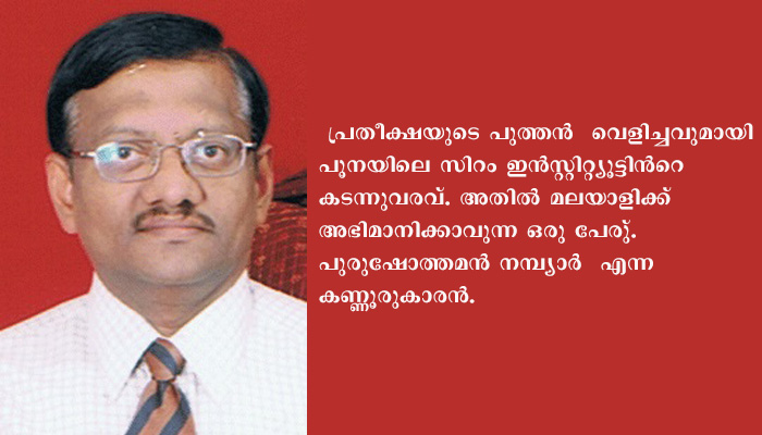 ന്യൂഡൽഹി: പ്രതീക്ഷയുടെ വെളിച്ചം നല്കി പൂനയിലെ സിറം ഇന്സ്റ്റിറ്റ്യൂട്ട് ലോകത്തിന്റെ മുമ്പില് ഒരു ചോദ്യചിഹ്നമായി അവശേഷിക്കുന്ന കോവിഡ് 19 എന്ന മാഹാമാരിയെ നേരിടാനുളള വാക്സിന് കണ്ടെത്തുക എന്നതിലാണ് മുഴുവന് ലോകത്തിന്റെയും ശ്രദ്ധയും കാത്തിരിപ്പും. അതിനിടയിലാണ് പ്രതീക്ഷയുടെ പുത്തന് വെളിച്ചവുമായി പൂനയിലെ സിറം ഇന്സ്റ്റിറ്റ്യൂട്ടിന്റെ കടന്നുവരവ്. അതില് മലയാളിക്ക് അഭിമാനിക്കാവുന്ന ഒരു പേരുണ്ട്. പുരുഷോത്തമന് നമ്പ്യാര് എന്ന കണ്ണൂരുകാരന്.
