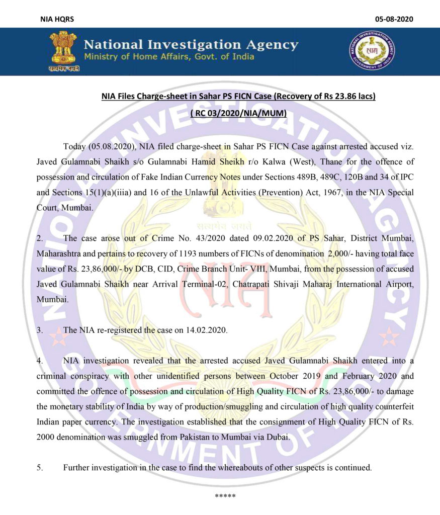 മുംബൈ താന സ്വദേശി ജാവേദ് ഗുലാം നബി ഷേയ്ഖിനെതിരെയുള്ള കുററപത്രം എൻ ഐ എ കോടതിയിൽ സമർപ്പിച്ചു. 2000 രൂപയുടെ ഇന്ത്യൻ നോട്ടുകൾ പാക്കിസ്ഥാനിൽ അച്ചടിച്ച് ദുബായ് വഴി മുംബൈയിൽ എത്തിച്ച് വിതരണം ചെയ്തു.