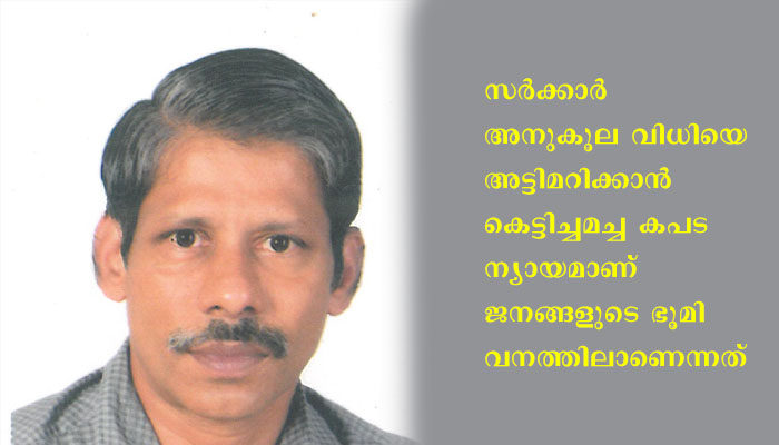വാസ്തവത്തില് ജനങ്ങളുടെ ഭൂമി 1958 ലെ നോട്ടിഫിക്കേഷന് പ്രകാരം വനപരിധിയില് വരുന്നില്ലന്നുളളതാണ് വാസ്തവം. സര്ക്കാര് അനുകൂല വിധിയെ അട്ടിമറിക്കാന് കെട്ടിച്ചമച്ച കപട ന്യായമാണ് ജനങ്ങളുടെ ഭൂമി വനത്തിലാണെന്നത്. അതിനാല് ഇയാളുടെ ഗൂഢോദ്ദേശം മനസിലാക്കി വനഭൂമി സ്വകാര്യ സ്വത്താക്കിമാറ്റാന് കൂട്ടുനില്ക്കുന്ന ബിസിസിഎഫിനെ ഈ ചുമതലയില് നിന്നും മാറ്റി നര്ത്തണമെന്നും സമരസമിതി സര്ക്കാരിനോടാവശ്യപ്പെട്ടു.