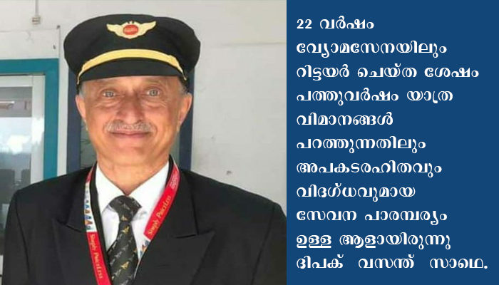 കരിപ്പൂർ: കരിപ്പൂർ വിമാനത്താവളത്തിൽ അപകടത്തിൽപ്പെട്ട എയർഇന്ത്യ വിമാനത്തിൻറെ പൈലറ്റ് ദീപക് വസന്ത് സാഥേ 32 വർഷത്തിന് പരിചയസമ്പത്ത് ഉള്ള ആളായിരുന്നു. 22 വർഷം വ്യോമസേനയിലും റിട്ടയർ ചെയ്ത ശേഷം പത്തുവർഷം യാത്ര വിമാനങ്ങൾ പറത്തുന്നതിലും അപകടരഹിതവും വിദഗ്ധവുമായ സേവന പാരമ്പര്യം ഉള്ള ആളായിരുന്നു ദിപക് വസന്ത് സാഥെ.