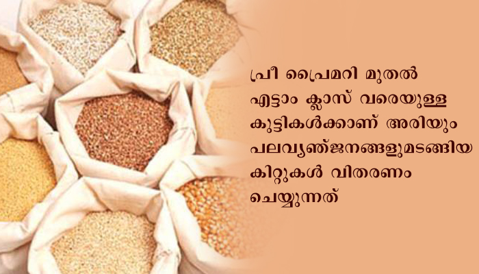 പ്രീ പ്രൈമറി വിഭാഗത്തിന് 1.2 കിലോഗ്രാം അരിയും, 261 രൂപയുടെ പല വ്യഞ്ജനങ്ങളും, പ്രൈമറി കുട്ടികള്ക്ക് നാല് കിലോഗ്രാം അരിയും 261 രൂപയുടെ പല വ്യഞ്ജനങ്ങളും, യു പി വിഭാഗത്തിന് ആറ് കിലോഗ്രാം അരി, 391 രൂപയുടെ പലവ്യഞ്ജനങ്ങളുമാണ് നല്കുന്നത്. ചെറുപയര്, കടല, തുവര പരിപ്പ്, പഞ്ചസാര, കറി പൗഡറുകള്, ആട്ട, ഉപ്പ്, തുടങ്ങി ഒമ്പത് ഇനങ്ങളാണ് അരിയ്ക്കു പുറമെ കിറ്റില് ഉള്പ്പെടുത്തിയിരിക്കുന്നത്.