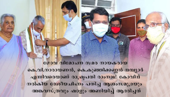 കാഞ്ഞങ്ങാട് പടന്നക്കാടെ വീട്ടിലെത്തി കെ വി നാരായണന് എ ഡി എം എന് ദേവീദാസ് രാഷ്ട്രപതിയുടെ ആദരം കൈമാറി അങ്കവസ്ത്രമണിയിച്ച് ആദരിച്ചു. ജില്ലാഇന്ഫര്മേഷന് ഓഫീസര് എം മധുസൂദനന്, കാഞ്ഞങ്ങാട് വില്ലേജ് ഓഫീസര് എ സി അബ്ദുള് സലാം, ജയേഷ് എന്നിവരും സ്വാതന്ത്ര്യസമര സേനാനി കെവി നാരായണന്റെ ഭാര്യ ലക്ഷ്മി, പ്രദോഷ് എന്നിവരും പങ്കെടുത്തു.