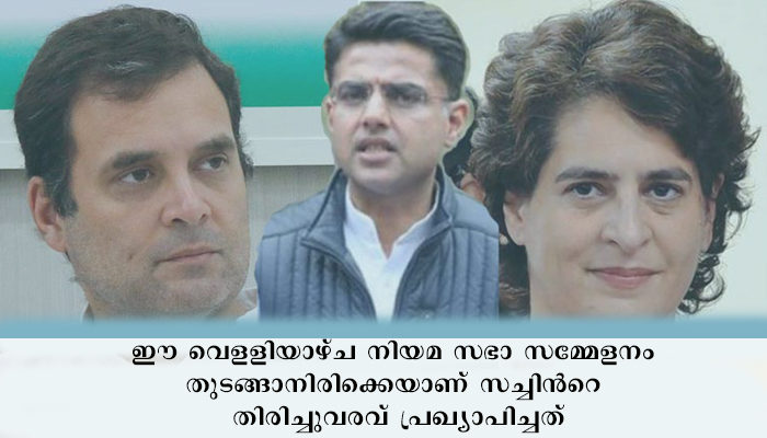 രാഹുലിന്റെ ഡല്ഹിയിലെ വസതിയില് വച്ചായിരുന്നു കൂടിക്കാഴ്ച്ച . പ്രിയങ്കാ ഗാന്ധിയുമായും സച്ചിന് ചര്ച്ച നടത്തിയിരുന്നു. സച്ചിന് പൈലറ്റും 18 എംഎല്എ മാരും വിമത ശബ്ദമുയര്ന്നതിനേ തുടര്ന്ന് കഴിഞ്ഞ ഒരുമാസമായി ഗെഹ് ലോട്ട് സര്ക്കാര് പ്രതിസന്ധിയിലായിരുന്നു. ഈ വെളളിയാഴ്ച നിയമ സഭാ സമ്മേളനം തുടങ്ങാനിരിക്കെയാണ് സച്ചിന്റെ തിരിച്ചുവരവ് പ്രഖ്യാപിച്ചത്.