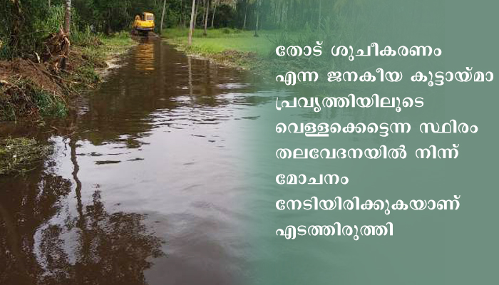 തൃശൂര് : കനത്ത മഴ പെയ്താല് സ്ഥിരമായി ഉണ്ടാകുന്ന വെള്ളക്കെട്ടിനെ പ്രതിരോധിക്കാന് മുന്നിട്ടിറങ്ങി എടത്തിരുത്തി പഞ്ചായത്ത്. തോട് ശുചീകരണം എന്ന ജനകീയ കൂട്ടായ്മാ പ്രവൃത്തിയിലൂടെ വെള്ളക്കെട്ടെന്ന സ്ഥിരം തലവേദനയില് നിന്ന് മോചനം നേടിയിരിക്കുകയാണ് എടത്തിരുത്തി. പഞ്ചായത്തിലെ പ്രധാന തോടായ ചിറക്കല്ചെറുപുഴയിലെയും ഉപതോടുകളിലെയും മാലിന്യം നീക്കി വെള്ളത്തിന്റെ ഒഴുക്ക് സുഗമമാക്കിയതോടെയാണിത്.