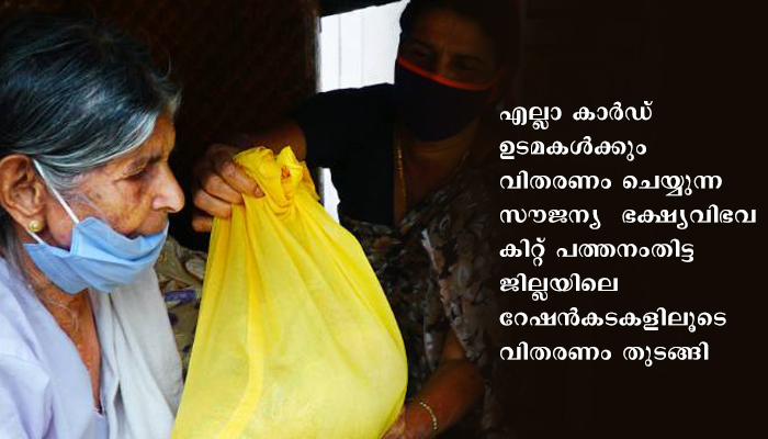 പത്തനംതിട്ട: കോവിഡ് 19-മായി ബന്ധപ്പെട്ട സമാശ്വാസപ്രവര്ത്തനങ്ങളുടെ ഭാഗമായും ഓണം പ്രമാണിച്ചും സംസ്ഥാന സര്ക്കാര് പൊതുവിതരണ വകുപ്പിലൂടെ എല്ലാ കാര്ഡ് ഉടമകള്ക്കും വിതരണം ചെയ്യുന്ന സൗജന്യ ഭക്ഷ്യവിഭവ കിറ്റ് പത്തനംതിട്ട ജില്ലയിലെ റേഷന്കടകളിലൂടെ വിതരണം തുടങ്ങി.