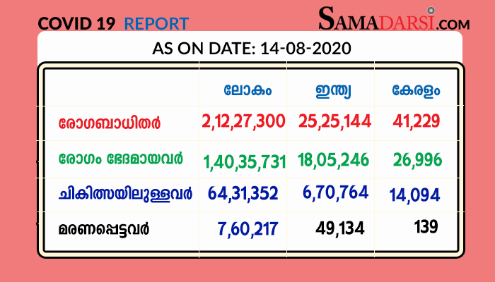 സംസ്ഥാനത്ത് വെള്ളിയാഴ്ച (14/08/2020) 1569 പേര്‍ക്ക് കൊറോണ സ്ഥിരീകരിച്ചു; 1354 പേര്‍ക്ക് സമ്പര്‍ക്കത്തിലൂടെ രോഗം ബാധിച്ചു; 1304 പേര്‍ക്ക് രോഗമുക്തി; 86 പേരുടെ ഉറവിടം വ്യക്തമല്ല; 10 മരണം