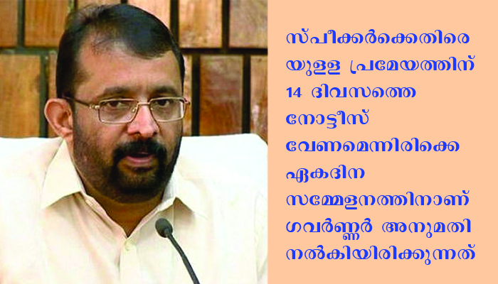 സ്പീക്കര്ക്കെതിരെയുളള നോട്ടീസ് സാങ്കേതികത്വം പാലിച്ചില്ലെങ്കില് തള്ളേണ്ടിവരുമെന്ന സ്പീക്കറുടെ പ്രസ്താവനക്കെതിരെ പ്രതിപക്ഷ നേതാവ് രമേശ് ചെന്നിത്തല രംഗത്തെത്തി. സ്പീക്കര്ക്കെതിരെയുളള പ്രമേയത്തിന് 14 ദിവസത്തെ നോട്ടീസ് വേണമെന്നിരിക്കെ ഏകദിന സമ്മേളനത്തിനാണ് ഗവര്ണ്ണര് അനുമതി നല്കിയിരിക്കുന്നത്.