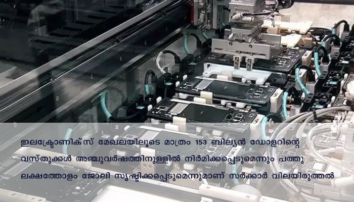 ഇലക്ട്രോണിക്സ് മേഖലയിലൂടെ മാത്രം 153 ബില്യന് ഡോളറിന്റെ വസ്തുക്കള് അഞ്ചുവര്ഷത്തിനുള്ളില് നിര്മിക്കപ്പെടുമെന്നും പത്തു ലക്ഷത്തോളം ജോലി സൃഷ്ടിക്കപ്പെടുമെന്നുമാണ് സര്ക്കാര് വിലയിരുത്തല്.