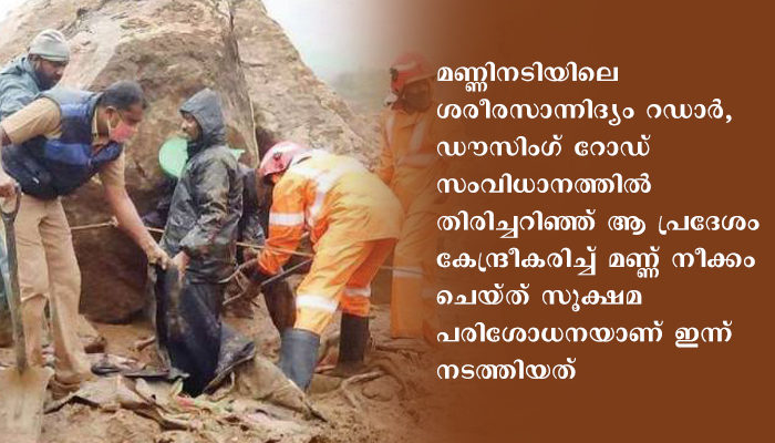 മണ്ണിനടിയില് ആറ് മീറ്റര് ആഴത്തില് വരെ സിഗ്നല് സംവിധാനമെത്തുന്ന റഡാര്, ഡൗസിംഗ് റോഡ് സംവിധാനമാണ് തിരച്ചിലിന് ഉപയോഗപ്പെടുത്തിയത്. ഡോഗ് സ്ക്വാഡിന്റെ നായകളെ ഉപയോഗിച്ചുള്ള തിരച്ചില് അവസാനിപ്പിച്ചു. നായകള്ക്ക് മൂന്നാറിലെ കാലാവസ്ഥയുമായി പൊരുത്തപ്പെടാന് കഴിയാത്തതിനാലാണ് ഡോഗ് സ്ക്വാഡിന്റെ സേവനം അവസാനിപ്പിച്ചത്.