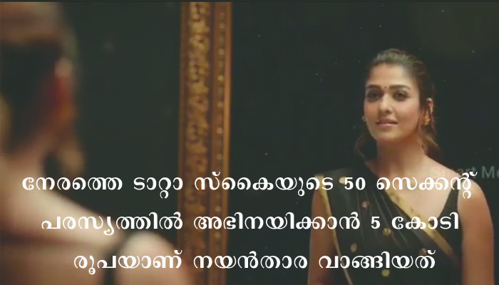 നേരത്തെ ടാറ്റാ സ്കൈയുടെ 50 സെക്കന്റ് പരസ്യത്തില് അഭിനയിക്കാന് 5 കോടി രൂപയാണ് നയന്താര വാങ്ങിയത്. ഇത് വലിയ രീതിയില് വാര്ത്തയായിരുന്നു. ഇപ്പോഴത്തെ പരസ്യത്തിന് എത്ര രൂപയാണ് നടിയുടെ പ്രതിഫലം എന്ന് പുറത്തു വിട്ടിട്ടില്ല. മുന് വര്ഷങ്ങളില് പോത്തീസ് ഡിസൈനര് സാരീസ്, ജി.ആര്.ടി ജ്വല്ലേഴ്സ്, ടാറ്റാ സ്കൈ, തനിഷ്ക് ജ്വല്ലറി എന്നിവയുടെ പരസ്യത്തില് നയന്താര അഭിനയിച്ചിട്ടുണ്ട്. അടുത്തിടെ നടി കത്രീന കൈഫിന്റെ ഒരു ബ്യൂട്ടി ബ്രാന്ഡിന്റെ പരസ്യത്തിലും നയന്സ് മുഖം കാണിച്ചിരുന്നു. സിനിമകളുടെ പ്രമോഷനും നടി കാര്യമായി പങ്കെടുക്കാറില്ല. ചില നിര്മാതാക്കള് ഇത് ചൂണ്ടിക്കാട്ടിയത് പലപ്പോഴും വിവാദങ്ങള്ക്കും ഇടവരുത്തിയിട്ടുണ്ട്.