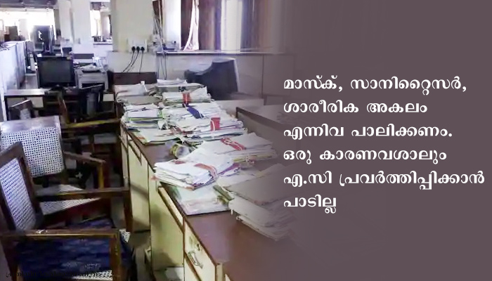 കണ്ടെയ്ന്മെന്റ് സോണുകളില് ഓഫീസ് പ്രവര്ത്തനത്തിന്റെ ഭാഗമായ യോഗങ്ങള് ചേരാവുന്നതാണ്. വീഡിയോ കോണ്ഫറന്സിംഗിലൂടെ യോഗങ്ങള് നടത്തുന്നതിന് പരമാവധി ശ്രദ്ധിക്കേണ്ടതും സാധ്യമല്ലാത്ത അവസരത്തില് മാത്രം കൊവിഡ് പ്രോട്ടോക്കോള് പാലിച്ചു കൊണ്ട് യോഗം നടത്താവുന്നതുമാണ്. മാസ്ക്, സാനിറ്റൈസര്, ശാരീരിക അകലം എന്നിവ പാലിക്കണം. ഒരു കാരണവശാലും എ.സി പ്രവര്ത്തിപ്പിക്കാന് പാടില്ല.