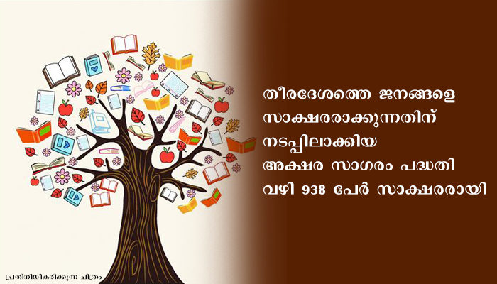 തീരദേശത്തെ ജനങ്ങളെ സാക്ഷരരാക്കുന്നതിന് നടപ്പിലാക്കിയ അക്ഷര സാഗരം പദ്ധതി വഴി 938 പേര് സാക്ഷരരായി. 9 തീരദേശ പഞ്ചായത്തുകളിലെ 45 വാര്ഡുകളിലാണ് പദ്ധതി നടത്തിയത്.കഴിഞ്ഞ നാലുവര്ഷത്തെ പ്രവര്ത്തന നേട്ടങ്ങള് അടങ്ങിയ റിപ്പോര്ട്ട് ജില്ലാ പഞ്ചായത്ത് പ്രസിഡന്റ് ജി.വേണുഗോപാല് പ്രകാശനം ചെയ്തു. ജില്ലാ പഞ്ചായത്ത് സെക്രട്ടറി കെ.ആര്.ദേവദാസ് റിപ്പോര്ട്ട് ഏറ്റുവാങ്ങി. സാക്ഷരതാ മിഷന് ജില്ലാ കോര്ഡിനേറ്റര് കെ.വി.രതീഷ്, അസിസ്റ്റന്റ് കോര്ഡിനേറ്റര് ആര്.സിംല, പി.കെ.ജോസഫ് എന്നിവര് ചടങ്ങില് പങ്കെടുത്തു.നാലുവര്ഷത്തിനുള്ളില് 3316 പേര് പത്താംതരം തുല്യതയും 4909 പേര് ഹയര് സെക്കണ്ടറി തുല്യതയും വിജയിച്ചതായി റിപ്പോര്ട്ടില് പറയുന്നു. നാലാംതരം തുല്യത 195 പേരും ഏഴാംതരം തുല്യത 480 പേരും വിജയിച്ചു.