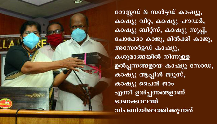 റോസ്റ്റഡ് & സള്ട്ടഡ് കാഷ്യൂ, കാഷ്യൂ വിറ്റ, കാഷ്യൂ പൗഡര്, കാഷ്യൂ ബിറ്റ്സ്, കാഷ്യൂ സൂപ്പ്, ചോക്കോ കാജു, മില്ക്കി കാജു, അസോര്ട്ടഡ് കാഷ്യൂ, കശുമാങ്ങയില് നിന്നുള്ള ഉല്പ്പന്നങ്ങളായ കാഷ്യൂ സോഡ, കാഷ്യൂ ആപ്പിള് ജ്യൂസ്, കാഷ്യൂ പൈന് ജാം എന്നീ ഉല്പ്പന്നങ്ങളാണ് ഓണക്കാലത്ത് വിപണിയിലെത്തിക്കുന്നത്.