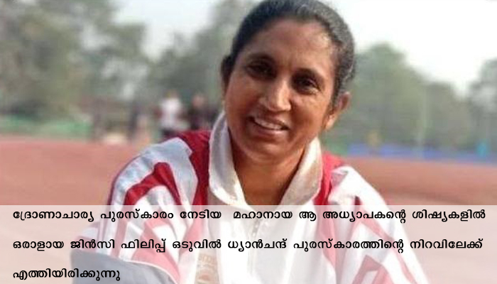ദ്രോണാചാര്യ പുരസ്കാരം നേടിയ മഹാനായ ആ അധ്യാപകന്റെ ശിഷ്യകളിൽ ഒരാളായ ജിൻസി ഫിലിപ്പ് ഒടുവിൽ ധ്യാൻചന്ദ് പുരസ്കാരത്തിന്റെ നിറവിലേക്ക് എത്തിയിരിക്കുന്നു.