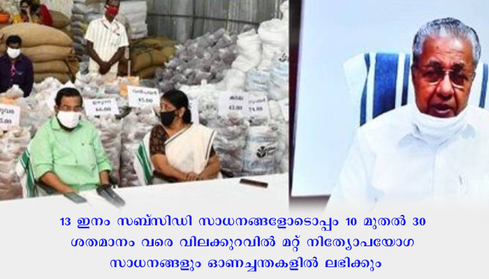 തിരുവനന്തപുരം: സഹകരണ വകുപ്പ് കൺസ്യൂമർ ഫെഡിന്റെ 1850 ഓണച്ചന്തകളുടെ സംസ്ഥാനതല ഉദ്ഘാടനം മുഖ്യമന്ത്രി പിണറായി വിജയൻ ഓൺലൈനായി നിർവഹിച്ചു. വിലക്കുറച്ച് സാധനങ്ങൾ ലഭ്യമാക്കി ആദായം ഉപഭോക്താവിന് എത്തിക്കുന്ന സാമൂഹ്യ പ്രതിബദ്ധതയോടുള്ള നടപടിയാണ് കൺസ്യൂമർഫെഡ് സ്വീകരിക്കുന്നതെന്ന് മുഖ്യമന്ത്രി പറഞ്ഞു. ആ മാതൃകാപരമായ നടപടികളാണ് കൺസ്യൂമർഫെഡിനെ ദുരിതക്കയത്തിൽനിന്ന് രക്ഷപ്പെടുന്ന അവസ്ഥയിലേക്ക് എത്തിക്കുന്നത്.
