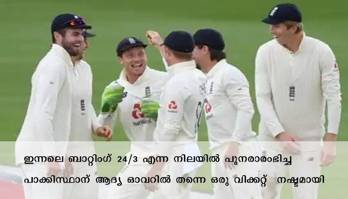 ഇന്നലെ ബാറ്റിംഗ് 24/3 എന്ന നിലയില് പുനരാരംഭിച്ച പാക്കിസ്ഥാന് ആദ്യ ഓവറില് തന്നെ ഒരു വിക്കറ്റ് നഷ്ടമായി.അസാദ് ഷഫീക്കിനെയാണ് ഒന്നാമത്തെ ഓവറിൽ തന്നെ ഇംഗ്ലണ്ട് പുറത്താക്കിയത്.