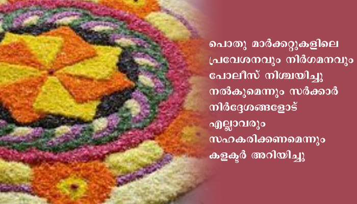 തിരുവനന്തപുരം: കോവിഡ് 19ന്റെ പശ്ചാത്തലത്തില് ഓണാഘോഷം വീടുകളില് മാത്രമായി പരിമിതപ്പെടുത്തണമെന്ന് ജില്ലാ കളക്ടര് ഡോ. നവജ്യോത് ഖോസ അറിയിച്ചു. ആഘോഷങ്ങള്ക്കായി ഹാളുകള്, ഓഡിറ്റോറിയങ്ങള് എന്നിവ ഉപയോഗിക്കരുത്. ഓഫീസുകളിലും പ്രാദേശിക തലത്തിലുമുള്ള ആഘോഷങ്ങള് കര്ശനമായി ഒഴിവാക്കണം. ബന്ധുവീടുകളിലും സുഹൃത്തുക്കളുടെ വീടുകളിലും സൗഹൃദ സന്ദര്ശനം ഒഴിവാക്കണം. കാറില് നാലുപേരില് കൂടുതല് യാത്ര ചെയ്യരുത്. ഓട്ടോറിക്ഷയില് പരമാവധി മൂന്ന് പേര്ക്ക് യാത്ര ചെയ്യാം.