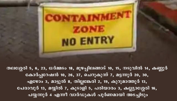 അതോടൊപ്പം, പുറമെ നിന്നെത്തിയവരില് രോഗബാധ കണ്ടെത്തിയ കതിരൂര് 15, മട്ടന്നൂര് 35, ആലക്കോട് 13 എന്നീ വാര്ഡുകളില് രോഗികളുടെ വീട് കേന്ദ്രമാക്കി 100 മീറ്റര് ചുറ്റളവില് വരുന്ന പ്രദേശങ്ങള് കണ്ടെയിന്മെന്റ് സോണുകളാക്കും.