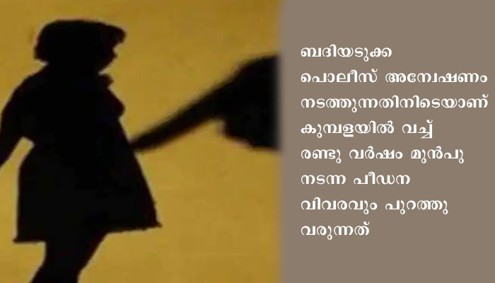 രണ്ട് വർഷം മുൻപാണ് കേസിന് ആസ്പദമായ സംഭവം. ഇതേ പെൺകുട്ടിയെ കാസർകോട് സ്വദേശിയായ ഒരാൾ പീഡിപ്പിച്ചു എന്ന പരാതിയിൽ ബദിയടുക്ക പൊലീസ് അന്വേഷണം നടത്തുന്നതിനിടെയാണ് കുമ്പളയിൽ വച്ച് രണ്ടു വർഷം മുൻപു നടന്ന പീഡന വിവരവും പുറത്തു വരുന്നത്.