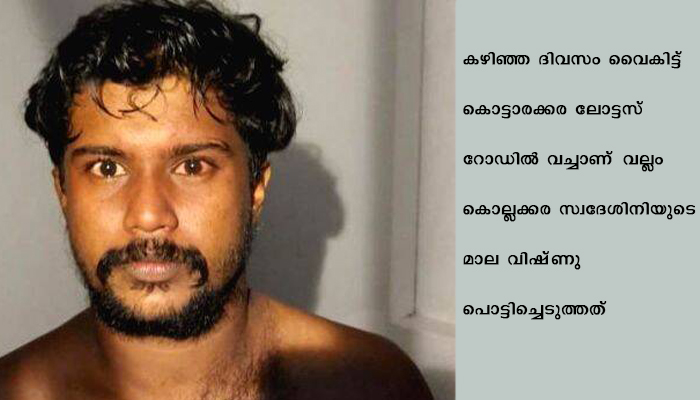 കഴിഞ്ഞ ദിവസം വൈകിട്ട് കൊട്ടാരക്കര ലോട്ടസ് റോഡില് വച്ചാണ് വല്ലം കൊല്ലക്കര സ്വദേശിനിയുടെ മാല വിഷ്ണു പൊട്ടിച്ചെടുത്തത് . ഇതിനുശേഷം ഇയാള് ഓടി രക്ഷപെടുകയായിരുന്നു. ജീവനക്കാരിയുടെ പരാതിയുടെ അടിസ്ഥാനത്തില് സ്ഥലത്തെത്തിയ പൊലീസ് മോഷ്ടാടാവിന്റെ ബൈക്ക് എടുക്കാനെത്തിയ സഹായിയെ കസ്റ്റടിയിലെ ടുക്കുകയും അതുവഴി പ്രതിയെ പിടികൂടുകയുമായിരുന്നു.