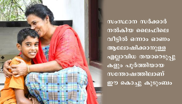 രണ്ടു മുറികളും, ഹാളും, സിറ്റ് ഔട്ടും, അടുക്കളയും, വര്ക്ക് ഏരിയയും, ടോയ്ലറ്റുമുള്ള സുന്ദരമായ ‘ലൈഫ്’ വീട്ടില് താമസിക്കുന്ന ബീനയും കുടുംബവും സംസ്ഥാന സര്ക്കാരിന് അകമഴിഞ്ഞ നന്ദി പറയുന്നു. ‘സ്വന്തമായി ഒരു വീട്, അത് സര്ക്കാര് തന്നതാണ്’ എന്ന് നാല്പ്പത് വയസുകാരിയായ ബീന പറയുന്നു. ബീനയ്ക്കും അനിലിനും പ്ലസ് വണിനും എട്ടാം ക്ലാസിലും പഠിക്കുന്ന മക്കളായ നവനീതിനും നവജിത്തിനും സുരക്ഷിതമായി കഴിയാനും ഓണം ആഘോഷിക്കാനും ഇപ്പോള് ഒരു വീടുണ്ട്. സ്വന്തമായി ഒരു മേല്വിലാസവും.