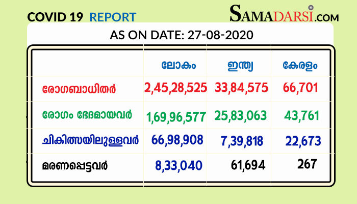 തിരുവനന്തപുരം: കേരളത്തില് വ്യാഴാഴ്ച (27.08.2020) 2406 പേര്ക്ക് കോവിഡ്-19 സ്ഥിരീകരിച്ചതായി മുഖ്യമന്ത്രി പിണറായി വിജയന്. തിരുവനന്തപുരം ജില്ലയില് നിന്നുള്ള 352 പേര്ക്കും, കോഴിക്കോട് ജില്ലയില് നിന്നുള്ള 238 പേര്ക്കും, കാസര്ഗോഡ് ജില്ലയില് നിന്നുള്ള 231 പേര്ക്കും, മലപ്പുറം ജില്ലയില് നിന്നുള്ള 230 പേര്ക്കും, പാലക്കാട് ജില്ലയില് നിന്നുള്ള 195 പേര്ക്കും, കോട്ടയം ജില്ലയില് നിന്നുള്ള 189 പേര്ക്കും, കൊല്ലം ജില്ലയില് നിന്നുള്ള 176 പേര്ക്കും, ആലപ്പുഴ ജില്ലയില് നിന്നുള്ള 172 പേര്ക്കും, പത്തനംതിട്ട ജില്ലയില് നിന്നുള്ള 167 പേര്ക്കും, തൃശൂര് ജില്ലയില് നിന്നുള്ള 162 പേര്ക്കും, എറണാകുളം ജില്ലകളില് നിന്നുള്ള 140 പേര്ക്ക് വീതവും, കണ്ണൂര് ജില്ലയില് നിന്നുള്ള 102 പേര്ക്കും, ഇടുക്കി ജില്ലയില് നിന്നുള്ള 27 പേര്ക്കും, വയനാട് ജില്ലയില് നിന്നുള്ള 25 പേര്ക്കുമാണ് വ്യാഴാഴ്ച രോഗബാധ സ്ഥിരീകരിച്ചത്.