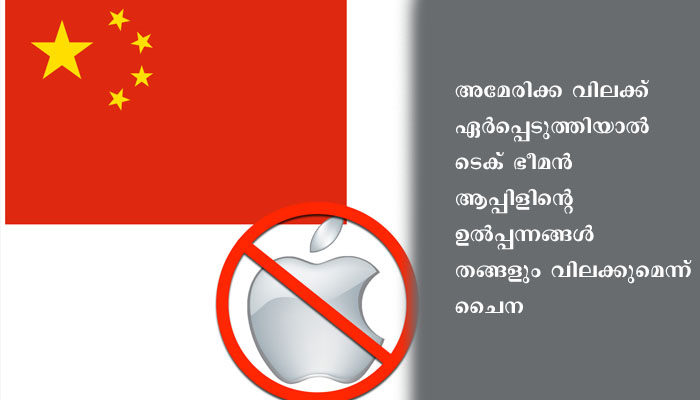 ബീജിങ്: ചൈനയുടെ വീ ചാറ്റ് പോലുള്ള മെസേജിങ് ആപ്പുകള്‍ക്ക് അമേരിക്ക വിലക്കേര്‍പ്പെടുത്തിയാല്‍ ടെക് ഭീമന്‍ ആപ്പിളിന്റെ ഉല്‍പ്പന്നങ്ങള്‍ തങ്ങളും വിലക്കുമെന്ന് ചൈന. ചൈനീസ് പൗരന്‍മാര്‍ക്കാണ് രാജ്യം ഇതുസംബന്ധിച്ച മുന്നറിയിപ്പ് നല്‍കിയിരിക്കുന്നത്. വ്യാപാര യുദ്ധമുണ്ടെങ്കിലും അമേരിക്കന്‍ കമ്പനികള്‍ക്ക് അവരുടെ ഉല്‍പ്പന്നങ്ങള്‍ ചൈനയില്‍ യഥേഷ്ടം വില്‍ക്കാന്‍ അനുമതിയുണ്ട്. ഉദാഹരണത്തിന് ആപ്പിള്‍ ചൈനയിലും ഹോങ് കോങിലും തായ്നിവാനിലുമായി 46.5 ബില്ല്യന്‍ ഡോളറിനുള്ള ഐഫോണ്‍ കഴിഞ്ഞ വര്‍ഷം മാത്രം വിറ്റിട്ടുണ്ട്.