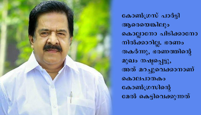 ‘കോണ്ഗ്രസ് പാര്ട്ടി ആരെയെങ്കിലും കൊല്ലാനോ പിടിക്കാനോ നില്ക്കാറില്ല. ഭരണം തകര്ന്നു, ഭരണത്തിന്റെ മുഖം നഷ്ടപ്പെട്ടു, അത് മറച്ചുവെക്കാനാണ് കൊലപാതകം കോണ്ഗ്രസിന്റെ മേല് കെട്ടിവെക്കുന്നത്. ഇതൊന്നും വിജയിക്കില്ല. ജനങ്ങള് വസ്തുത തിരിച്ചറിയും’ ചെന്നിത്തല മാധ്യമങ്ങളോട് പ്രതികരിച്ചു.