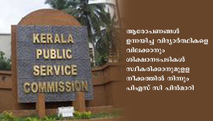 തിരുവനന്തപുരം: സാമൂഹ്യ മാധ്യമങ്ങളിലൂടെ പിഎസ്‌.സി ക്കെതിരെ ആരോപണങ്ങള്‍ ഉന്നയിച്ച വിദ്യാര്‍ത്ഥികളെ വിലക്കാനും ശിക്ഷാനടപടികള്‍ സ്വീകരിക്കാനുമുളള നീക്കത്തില്‍ നിന്നും പിഎസ്‌ സി പിന്‍മാറി. കാസര്‍കോഡ്‌ ജില്ലയിലെ സ്‌റ്റാഫ്‌ നഴ്‌സ്‌ , ആയുര്‍വേദ കോളേജിലെ ഫിസിയോ തെറാപ്പിസ്റ്റ്‌, തുടങ്ങിയ തസ്ഥികളിലെ ഉദ്യോഗാര്‍ത്ഥികള്‍ക്കെതിരെ ശിക്ഷാ നടപടി സ്വീകരിക്കുമെന്ന്‌ പിഎസ്‌ സി നേരത്തേ വ്യക്തമാക്കിയിരുന്നു.