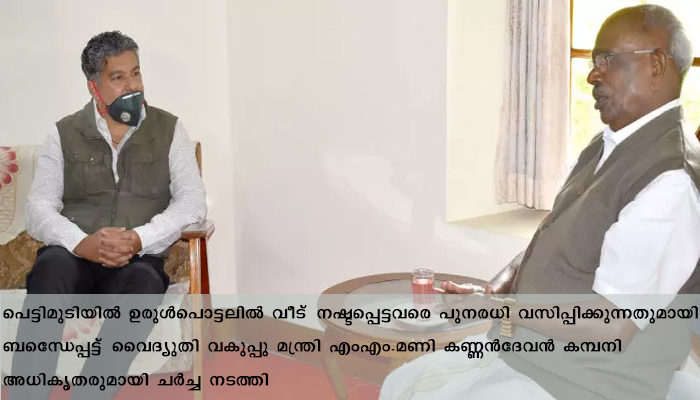 മൂന്നാര്: പെട്ടിമുടിയില് ഉരുള്പൊട്ടലില് വീട് നഷ്ടപ്പെട്ടവരെ പുനരധി വസിപ്പിക്കുന്നതുമായി ബന്ധെേപ്പട്ട് വൈദ്യുതി വകുപ്പു മന്ത്രി എംഎം.മണി കണ്ണന്ദേവന് കമ്പനി അധികൃതരുമായി ചര്ച്ച നടത്തി. 2020 ആഗസ്റ്റ് 30 ന് ഞായറാഴ്ച രാവിലെ മൂന്നാര് ഗസ്റ്റ്ഹൗസില് വെച്ചായിരുന്നു കമ്പനി എംഡി മാത്യു എബ്രാഹവുമായുളള ചര്ച്ച.