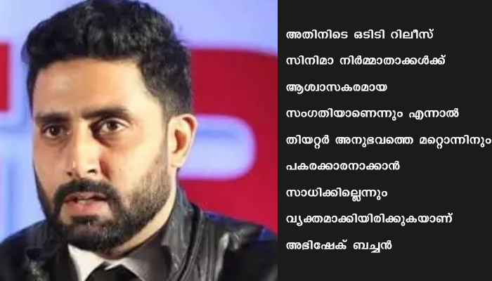 അതിനിടെ ഒടിടി റിലീസ് സിനിമാ നിര്മ്മാതാക്കള്ക്ക് ആശ്വാസകരമായ സംഗതിയാണെന്നും എന്നാല് തിയറ്റര് അനുഭവത്തെ മറ്റൊന്നിനും പകരക്കാരനാക്കാന് സാധിക്കില്ലെന്നും വ്യക്തമാക്കിയിരിക്കുകയാണ് അഭിഷേക് ബച്ചന്. അദ്ദേഹത്തിന്റെ ലൂഡോ, ദി ബിഗ് ബുള് എന്നീ ചിത്രങ്ങള് ഒടടി പ്ലാറ്റ് ഫോമില് ഉടന് റിലീസ് ചെയ്യാന് ഇരിക്കുകയാണ്. ഇ്ത് സംബന്ധിച്ച സംസാരത്തിനിടെയാണ് അഭിഷേക് തന്റെ അഭിപ്രായം തുറന്ന് പറഞ്ഞത്.
