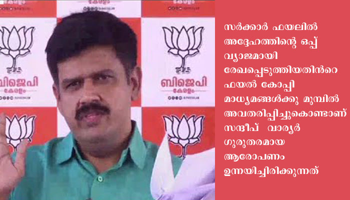 തിരുവനന്തപുരം: ഗുരുതരമായ ആരോപണവുമായി ബിജെപിയുടെ വക്താവ് സന്ദീപ് വാര്യർ മുഖ്യമന്ത്രിക്കെതിരെ രംഗത്തുവന്നു. മുഖ്യമന്ത്രി രോഗചികിത്സക്കായി 2018 സെപ്റ്റംബറിൽ അമേരിക്കയിലായിരുന്ന സമയത്ത് സർക്കാർ ഫയലിൽ അദ്ദേഹത്തിൻറെ ഒപ്പ് വ്യാജമായി രേഖപ്പെടുത്തിയതിന്‍റെ ഫയൽ കോപ്പി മാധ്യമങ്ങൾക്കു മുമ്പിൽ അവതരിപ്പിച്ചുകൊണ്ടാണ് സന്ദീപ് വാര്യർ ഗുരുതരമായ ഈ ആരോപണം ഉന്നയിച്ചിരിക്കുന്നത്. തിരുവനന്തപുരത്തെ ബിജെപി ആസ്ഥാനത്ത് മാധ്യമപ്രവർത്തകരോടാണ് ഈ വിവരം വെളിപ്പെടുത്തിയത്. മലയാളഭാഷയുമായി ബന്ധപ്പെട്ട ഫയലിൽ ആണ് കള്ള ഒപ്പ്. 2018 സെപ്റ്റംബർ ഒമ്പതിനാണ് ഫയലില്‍ ഒപ്പിട്ടിരിക്കുന്നത്. രണ്ടുദിവസം മുമ്പ് മുഖ്യമന്ത്രിയുടെ ഓഫീസിൽ എത്തിയതാണ് ഫയൽ. സെപ്റ്റംബർ 13 ന് ബന്ധപ്പെട്ട വകുപ്പിലേക്ക് മടക്കുകയും ചെയ്തു. ആ മാസം ആരംഭം മുതൽ ഇരുപത്തി മൂന്നാം തീയതി വരെ മുഖ്യമന്ത്രി അമേരിക്കയിലായിരുന്നു. ഈ സമയത്ത് മുഖ്യമന്ത്രിയുടെ എന്ന് തോന്നുന്ന വിധത്തിൽ കള്ള ഒപ്പിട്ട നടപടി ഗുരുതരമായ കുറ്റമാണ്. അതേപ്പറ്റി മുഖ്യമന്ത്രി വിശദീകരിക്കണം. മുഖ്യമന്ത്രിയുടെ ഓഫീസിൽ സ്ഥിരമായി കളള ഒപ്പിടുന്ന ആരോ ഉണ്ട്. മുഖ്യമന്ത്രി തിരുവനന്തപുരത്ത് ഉള്ളപ്പോഴും ഇയാൾ ഒപ്പിട്ട് ഇരിക്കാം. ചിലതൊക്കെ മുഖ്യമന്ത്രി പറഞ്ഞിട്ട് ആകാം. ചിലത് അറിയാതെയും ആകാം. ആ പതിവു വച്ച് മുഖ്യമന്ത്രി അമേരിക്കയിലായിരുന്ന സമയത്തും ഒപ്പിട്ടു എന്നാണ് കരുതേണ്ടത്. സന്ദീപ് വാര്യർ ആരോപിച്ചു.