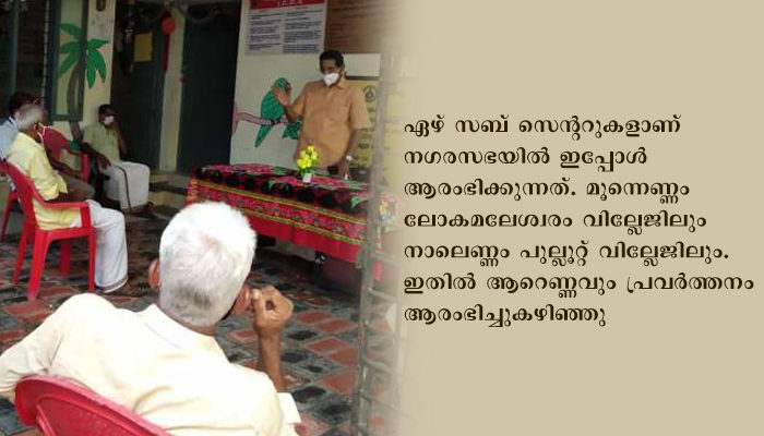 ഏഴ് സബ് സെന്ററുകളാണ് നഗരസഭയില് ഇപ്പോള് ആരംഭിക്കുന്നത്. മൂന്നെണ്ണം ലോകമലേശ്വരം വില്ലേജിലും നാലെണ്ണം പുല്ലൂറ്റ് വില്ലേജിലും. ഇതില് ആറെണ്ണവും പ്രവര്ത്തനം ആരംഭിച്ചുകഴിഞ്ഞു.