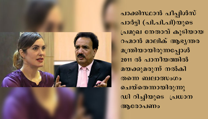 പാക്കിസ്ഥാന് പീപ്പിള്സ് പാര്ട്ടി (പി.പി.പി)യുടെ പ്രമുഖ നേതാവ് കൂടിയായ റഹ്മാന് മാലിക് ആഭ്യന്തര മന്ത്രിയായിരുന്നപ്പോള് 2011ല് പാനീയത്തില് മയക്കുമരുന്ന് നല്കി തന്നെ ബലാത്സംഗം ചെയ്തെന്നായിരുന്നു ഡി റിച്ചിയുടെ പ്രധാന ആരോപണം.