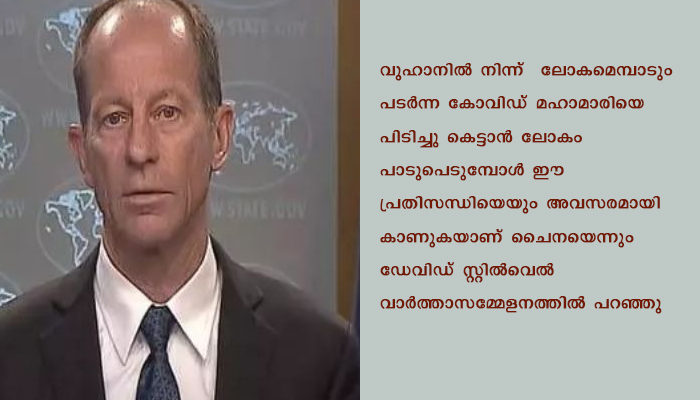 വുഹാനില്‍ നിന്ന് ലോകമെമ്പാടും പടര്‍ന്ന കോവിഡ് മഹാമാരിയെ പിടിച്ചു കെട്ടാന്‍ ലോകം പാടുപെടുമ്പോള്‍ ഈ പ്രതിസന്ധിയെയും അവസരമായി കാണുകയാണ് ചൈനയെന്നും ഡേവിഡ് സ്റ്റില്‍വെല്‍ വാര്‍ത്താസമ്മേളനത്തില്‍ പറഞ്ഞു.ഇന്ത്യചൈന അതിര്‍ത്തി സംഘര്‍ഷം രമ്യമായി പരിഹരിക്കുമെന്നാണ് യുഎസിന്റെ പ്രതീക്ഷയെന്ന യുഎസ് സ്റ്റേറ്റ് സെക്രട്ടറി മൈക്ക് പോംപെയോയുടെ പ്രസ്താവന വാര്‍ത്താസമ്മേളനത്തില്‍ ഡേവിഡ് സ്റ്റില്‍വെല്‍ ആവര്‍ത്തിച്ചു.
