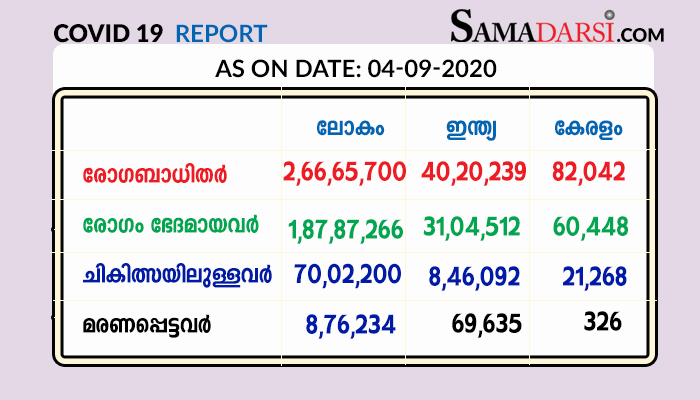 34 ആരോഗ്യ പ്രവര്ത്തകര്ക്കാണ് വെള്ളിയാഴ്ച രോഗം ബാധിച്ചത്. തിരുവനന്തപുരം ജില്ലയിലെ 10, കണ്ണൂര് ജില്ലയിലെ 8, പത്തനംതിട്ട, ആലപ്പുഴ ജില്ലകളിലെ 5 വീതവും, എറണാകുളം ജില്ലയിലെ 4, കൊല്ലം, തൃശൂര് ജില്ലകളിലെ ഒന്നും വീതം ആരോഗ്യ പ്രവര്ത്തകര്ക്കാണ് രോഗം ബാധിച്ചത്. തൃശൂര് ജില്ലയില് എ.ആര്. ക്യാമ്പിലെ 60 പേര്ക്കും രോഗം ബാധിച്ചു.