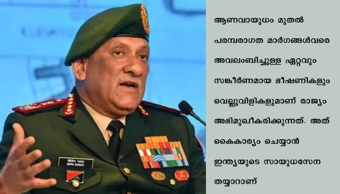 ന്യൂഡല്ഹി: ചൈനയ്ക്ക് തക്ക മറപടി നല്കാനുള്ള കഴിവ് ഇന്ത്യയുടെ സായുധ സേനയ്ക്കുണ്ടെന്ന് സംയുക്ത സേനാമേധാവി ജനറല് ബിപിന് റാവത്ത് പറഞ്ഞു. യു.എസ്.-ഇന്ത്യ സ്ട്രാറ്റജിക് പാര്ട്ണര്ഷിപ്പ് ഫോറം സംവാദത്തിലാണ് അദ്ദേഹത്തിന്റെ പ്രതികരണം. വിശ്വസനീയമായ സൈനിക ഇടപെടലും പ്രാദേശികമായ സ്വാധീനവും ഇല്ലാതെയാണ് ഇന്ത്യയുടെ നീക്കങ്ങളെങ്കില് അത് മേഖലയിലെ ചൈനയുടെ പ്രാധാന്യം അംഗീകരിക്കുന്നതിനു തുല്യമാവുമെന്ന് അദ്ദേഹം പറഞ്ഞു.
