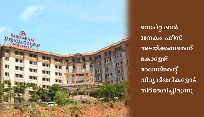 2018 ഓഗസ്റ്റില് തങ്ങള് കോളേജില് പ്രവേശനം നേടുമ്പോള് തന്നെ പരിയാരം മെഡിക്കല് കോളേജ് സര്ക്കാര് ഏറ്റെടുത്തിരുന്നു എന്നാണ് മൂന്നാം വര്ഷ വിദ്യാര്ത്ഥികളുടെ വാദം. സര്ക്കാര് ഫീസ് മാത്രമേ മൂന്നാം വര്ഷ വിദ്യാര്ത്ഥികളില് നിന്ന് ഈടാക്കാവു എന്ന് ആവശ്യപ്പെട്ട് ഒരുവിഭാഗം വിദ്യാര്ത്ഥികള് നല്കിയ ഹര്ജിയില് സുപ്രീം കോടതി ജൂലൈ 28ന് നോട്ടീസ് അയച്ചിരുന്നു. സംസ്ഥാന സര്ക്കാരും കോളേജ് മാനേജ്മെന്റും ഉള്പ്പെടെയുള്ള എതിര്കക്ഷികള്ക്കായിരുന്നു നോട്ടീസ്.