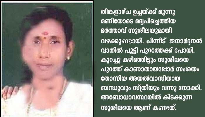 ദിവസവും മദ്യപിച്ചെത്തി ഇയാൾ ഭാര്യയെ മർദിക്കാൻ ഉണ്ടെന്ന് അയൽവാസികൾ പൊലീസിനോട് പറഞ്ഞു. തിങ്കളാഴ്ച ഉച്ചയ്ക്ക് മൂന്നുമണിയോടെ മദ്യപിച്ചെത്തിയ ഭർത്താവ് സുശീലയുമായി വഴക്കുണ്ടായി. പിന്നീട് ജനാർദ്ദനൻ വാതിൽ പൂട്ടി പുറത്തേക്ക് പോയി. കുറച്ചു കഴിഞ്ഞിട്ടും സുശീലയെ പുറത്ത് കാണാതായപ്പോർ സംശയം തോന്നിയ അയൽവാസിയായ ബന്ധുവും സ്ത്രീയും വന്നു നോക്കി. അബോധാവസ്ഥയിൽ കിടക്കുന്ന സുശീലയെ ആണ് കണ്ടത്. ഉടനെ തന്നെ പോലീസിൽ വിവരമറിയിച്ചു. പോലീസിന്റെ സഹായത്തോടെ ആശുപത്രിയിലെത്തിച്ചെങ്കിലും മരണപ്പെടുകയായിരുന്നു. ബദിയടുക്ക പോലീസ് ജനാർദ്ദനനെ കസ്റ്റഡിയിലെടുത്തു.