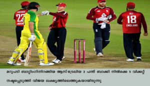 26 പന്തില് 39 റണ്സ് നേടിയ നായകന് ആരോണ് ഫിഞ്ചും പുറത്താകാതെ 36 പന്തില് 39 റണ്സെടുത്ത മിച്ചല് മാര്ഷും ആണ് ആസ്ട്രേലിയയെ രക്ഷിച്ചത്. റഷീദ് ഇംഗ്ലണ്ടിനായി 3 വിക്കറ്റ് വീഴ്ത്തി.