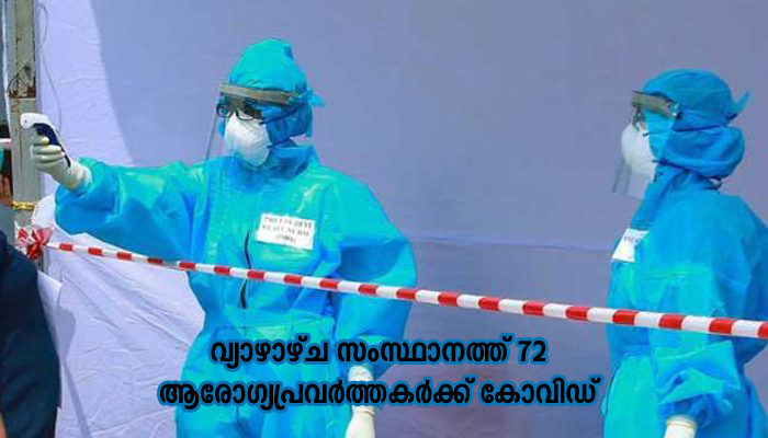 തിരുവനന്തപുരം : സംസ്ഥാനത്തെ 10-09-2020, വ്യാഴാഴ്ച 72 ആരോഗ്യപ്രവർത്തകർക്കാണ് കോവിഡ് സ്ഥിരീകരിച്ചിട്ടുള്ളത്. തൃശ്ശൂർ 13, കണ്ണൂർ 18, തിരുവനന്തപുരം 12, കൊല്ലം 9, എറണാകുളം 11, മലപ്പുറം മൂന്ന്, പത്തനംതിട്ട രണ്ട്, ആലപ്പുഴ, പാലക്കാട്, വയനാട്, കാസർകോട്, ഒന്ന് വീതം ഇങ്ങനെയാണ് ജില്ല തിരിച്ചുള്ള കണക്കുകൾ.