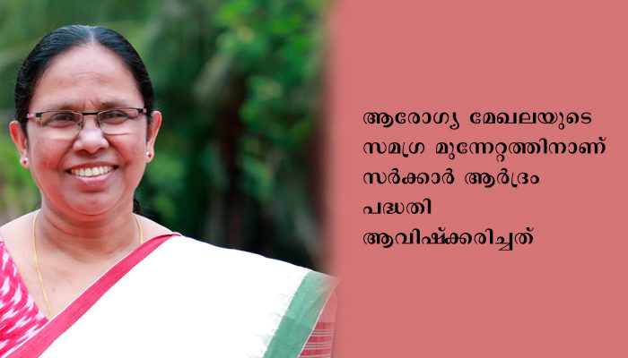ആദ്രം മിഷന്റെ ഭാഗമായി ആശുപത്രികളുടെ ഭൗതിക സാഹചര്യം മെച്ചപ്പെടുത്താനാണ് ശ്രമിച്ചത്. ആശുപത്രിയുടെ കിടക്കകള് പോലും തെരഞ്ഞെടുക്കുന്നതിന് പ്രത്യേകം ശ്രദ്ധിച്ചു. രോഗീ സൗഹൃദം, ഹൈടെക് ആക്കുക, സൗജന്യമായും കുറഞ്ഞ ചെലവിലുമുള്ള ചികിത്സ എന്നിവയിലാണ് പ്രധാനമായും ശ്രദ്ധിച്ചത്. എല്ലാതലം ആശുപത്രികളേയും സേവനം വര്ധിപ്പിച്ചു. 44 താലൂക്ക് ആശുപത്രികളില് ഡയാലിസിസ് സെന്റര് ആരംഭിച്ചിട്ടുണ്ട്. 67 താലൂക്ക് ആശുപത്രികളില് ഡയാലിസിസ് കേന്ദ്രങ്ങളാക്കാനുള്ള പ്രവര്ത്തനങ്ങള് പുരോഗമിച്ചു വരുന്നു. ജില്ലാ ജനറല് ആശുപത്രികളില് കാത്ത് ലാബ് അനുവദിച്ചു. 5 ജില്ലാ ആശുപത്രികളില് സ്ട്രോക്ക് സെന്റര് സജ്ജമാക്കി.