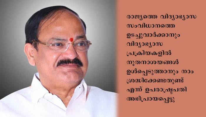 രാജ്യത്തെ വിദ്യാഭ്യാസ സംവിധാനത്തെ ഉടച്ചുവാർക്കാനും വിദ്യാഭ്യാസ പ്രക്രിയകളിൽ നൂതനാശയങ്ങൾ ഉൾപ്പെടുത്താനും നാം ശ്രദ്ധിക്കേണ്ടതുണ്ട് എന്ന് ഉപരാഷ്ട്രപതി അഭിപ്രായപ്പെട്ടു. എങ്കിൽ മാത്രമേ ഇരുപത്തിയൊന്നാം നൂറ്റാണ്ടിലെ വെല്ലുവിളികളെ ഫലപ്രദമായി നേരിടാൻ നമുക്ക് സാധിക്കൂ. പുതിയ ആശയങ്ങളെ സ്വീകരിക്കാൻ കഴിയുന്ന, വ്യത്യസ്ത അഭിപ്രായങ്ങളോട് സഹിഷ്ണുത പുലർത്തുന്ന, ആഗോള സമാധാനം, എല്ലാവരെയും ഉൾപ്പെടുത്തിക്കൊണ്ടുള്ള മനുഷ്യ പുരോഗതി എന്നിവയ്ക്ക് പ്രതിജ്ഞാബദ്ധരായ വ്യക്തികളുടെ രൂപീകരണം ആയിരിക്കണം വിദ്യാഭ്യാസത്തിലൂടെ സംഭവിക്കേണ്ടത് എന്ന് അദ്ദേഹം ഓർമ്മിപ്പിച്ചു.