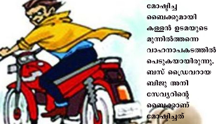 ഉദയംപേരൂർ നടക്കാവിനു സമീപം 10-9 -2020 വ്യാഴാഴ്ച വൈകീട്ടായിരുന്നു സംഭവം. മോഷ്ടിച്ച ബൈക്കുമായി കള്ളൻ ഉടമയുടെ മുന്നിൽത്തന്നെ വാഹനാപകടത്തിൽ പെടുകയായിരുന്നു. ബസ് ഡ്രൈവറായ ബിജു അനി സേവ്യറിൻ്റെ ബൈക്കാണ് മോഷ്ടിച്ചത്. ചങ്ങനാശ്ശേരി സ്വദേശി ജിജോ എന്ന യുവാവാണ് മോഷ്ടാവ്. ബൈക്ക് കാണാതായതിന് ബിജു കോട്ടയം പോലീസിൽ പരാതി കൊടുത്തിരുന്നു.
